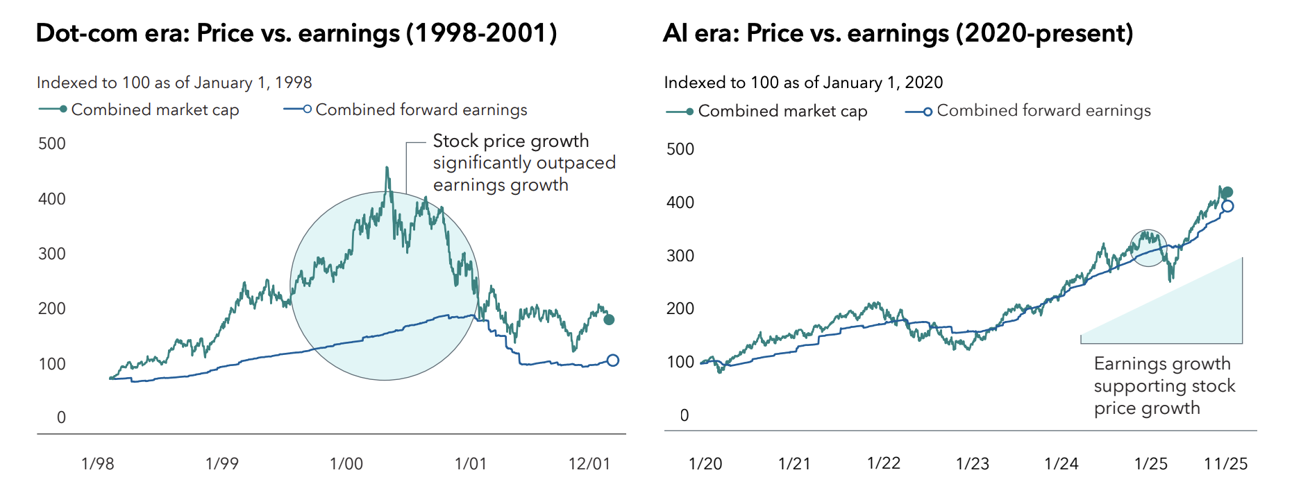 Sources: Capital Group, Bloomberg. Data aggregates forward 12-month net income (“forward earnings”) and market capitalization (“market cap”) for the “Four Horsemen” of the dot-com era: Microsoft, Cisco, Intel and Dell, four of the largest and best performing companies of that period. Indexed to 100 on January 1, 1998. Capital Group, Bloomberg. Data aggregates forward 12-month net income (“forward earnings”) and market capitalization (“market cap”) for NVIDIA, Microsoft, Apple, Amazon, Meta, Broadcom and Alphabet, seven of the largest AI-exposed companies. Data indexed to 100 on January 1, 2020. As of November 30, 2025. Past results are not predictive of results in future periods.