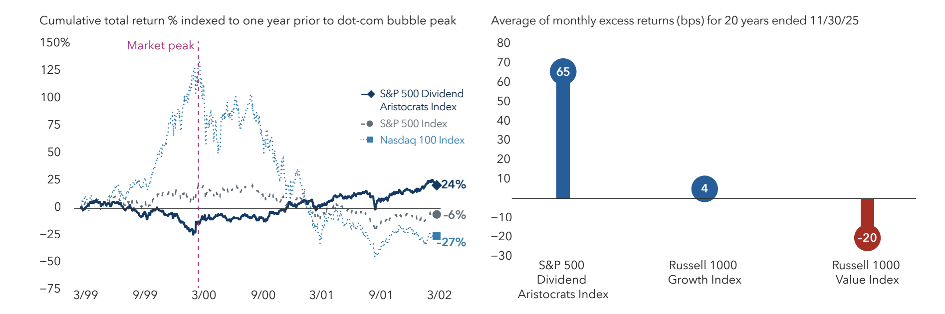 Sources: Capital Group, Bloomberg, Nasdaq, Standard & Poor’s. Dot-com bubble peak date used is March 24, 2000, the peak of the S&P 500 Index. Data shown is through March 24, 2002. Dividend payers are represented by the S&P 500 Dividend Aristocrats Index, which measures the performance of S&P 500 companies that have increased dividends the past 25 years. Capital Group, FTSE Russell, Morningstar, Standard & Poor’s. Figures reflect the average difference in monthly total returns between the index specified and the S&P 500 Index, across all months in which the S&P 500 Index had a negative return. As of November 30, 2025. Past results are not predictive of results in future periods.