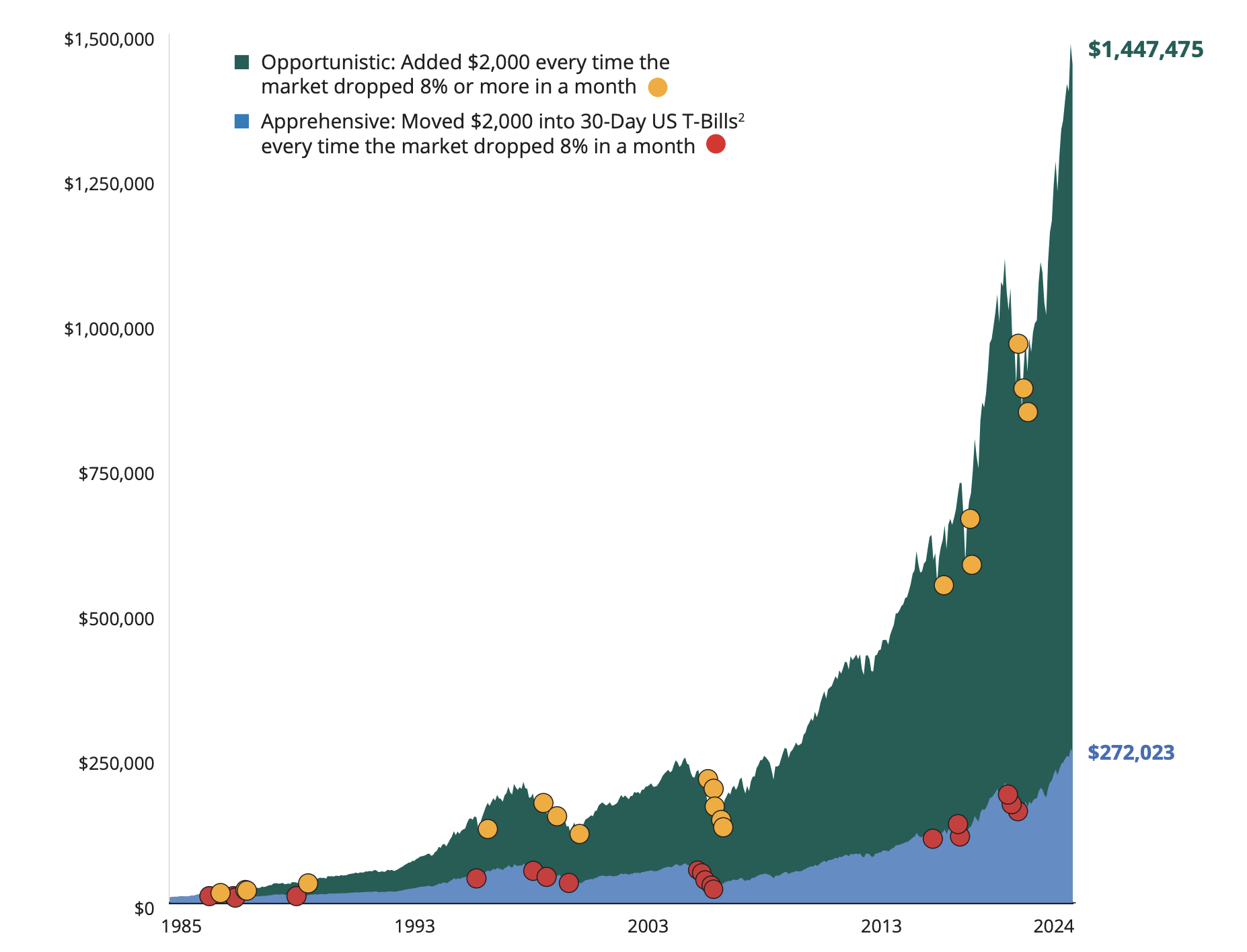 What was the effect of two different historical approaches to volatility? Each assumes $10,000 invested on 12/31/84 into the S&P 500 Index; however, the opportunistic investor made additions when the market dropped, and the apprehensive investor shifted assets in the face of volatility. Ultimately, the opportunistic investor had a significantly higher investment value at the end. Investors should consider their financial ability to regularly make sizable investments during a prolonged market downturn.