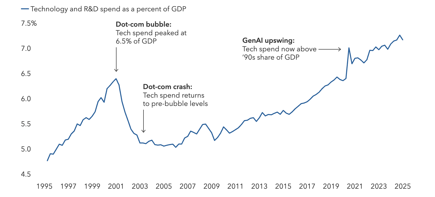Sources: Capital Group, U.S. Census Bureau, Bureau of Economic Analysis, Haver Analytics. R&D is research and development. As of August 20, 2025.